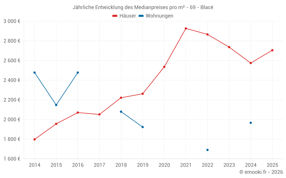 Der Durchschnittspreis auf den 16 Hausgeschäften der letzten 12 Monate in der Gemeinde Blacé betrug 2 558 € pro Quadratmeter für einen mittleren Immobilienwert von 304 425 €. Über diesen Zeitraum hinweg lagen 60% der Transaktionen zwischen 2 206 und 3 458 € pro Quadratmeter (vom 2. bis zum 8. Dezil).