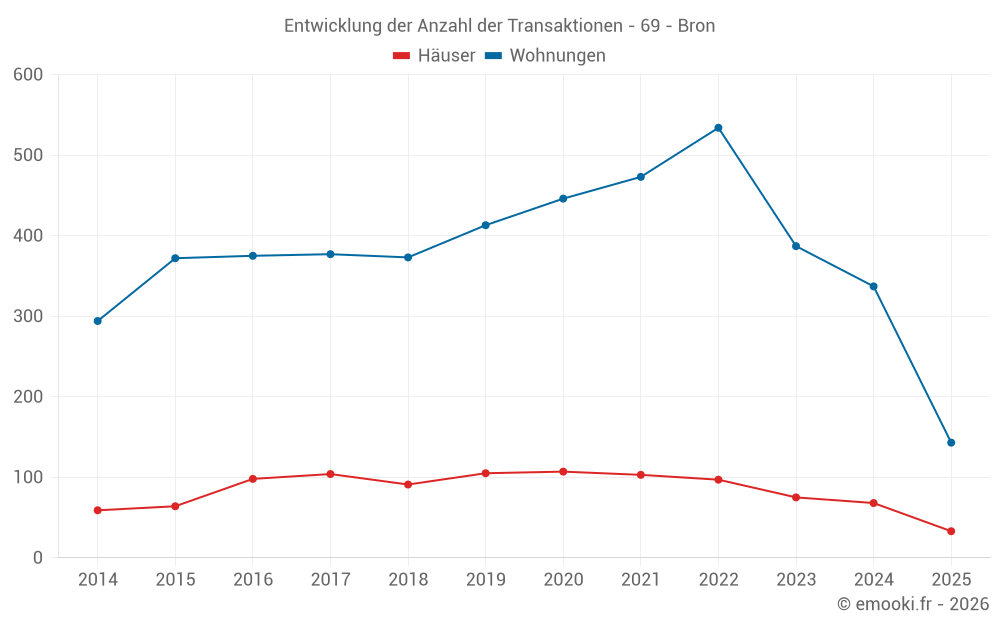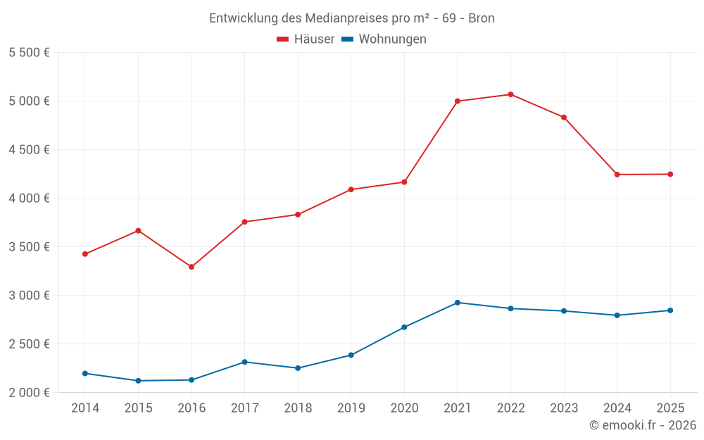 Der Durchschnittspreis auf den 33 Hausgeschäften der letzten 6 Monate in der Gemeinde Bron betrug 4 248 € pro Quadratmeter für einen mittleren Immobilienwert von 395 230 €. Über diesen Zeitraum hinweg lagen 60% der Transaktionen zwischen 3 182 und 5 275 € pro Quadratmeter (vom 2. bis zum 8. Dezil).