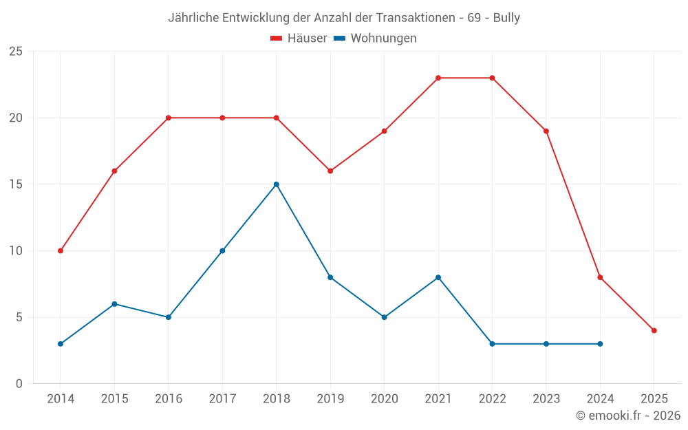 Der Durchschnittspreis auf den 19 Hausgeschäften der letzten 24 Monate in der Gemeinde Bully betrug 3 087 € pro Quadratmeter für einen mittleren Immobilienwert von 319 500 €. Über diesen Zeitraum hinweg lagen 60% der Transaktionen zwischen 2 216 und 4 097 € pro Quadratmeter (vom 2. bis zum 8. Dezil).