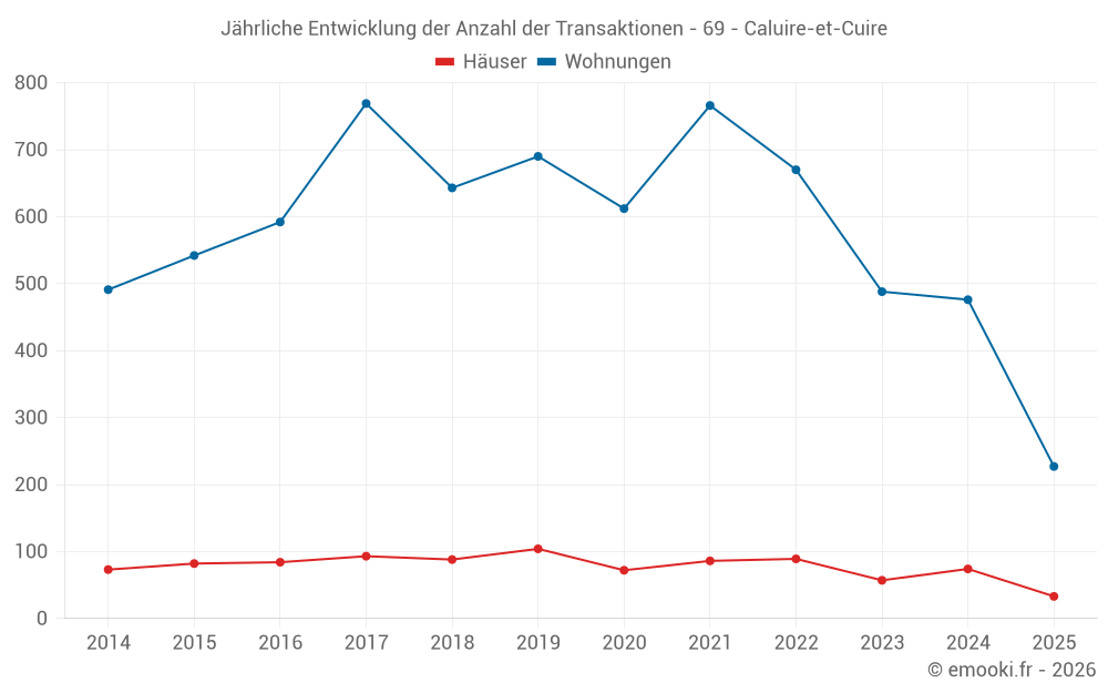 Der Durchschnittspreis auf den 33 Hausgeschäften der letzten 6 Monate in der Gemeinde Caluire-et-Cuire betrug 5 484 € pro Quadratmeter für einen mittleren Immobilienwert von 650 000 €. Über diesen Zeitraum hinweg lagen 60% der Transaktionen zwischen 4 566 und 7 695 € pro Quadratmeter (vom 2. bis zum 8. Dezil).