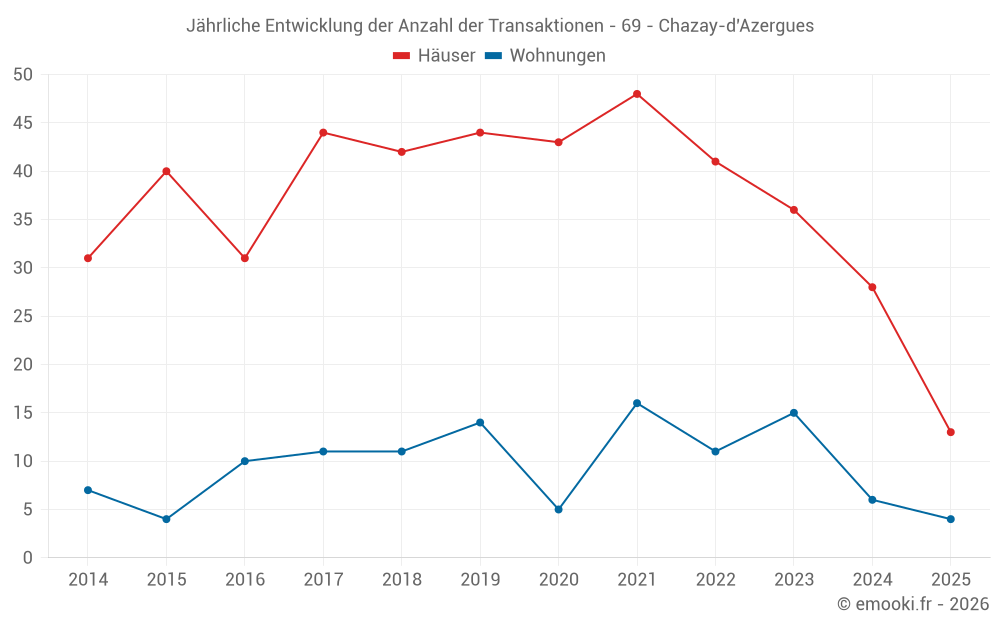 Der Durchschnittspreis auf den 32 Hausgeschäften der letzten 12 Monate in der Gemeinde Chazay-d'Azergues betrug 3 630 € pro Quadratmeter für einen mittleren Immobilienwert von 380 000 €. Über diesen Zeitraum hinweg lagen 60% der Transaktionen zwischen 2 977 und 4 673 € pro Quadratmeter (vom 2. bis zum 8. Dezil).