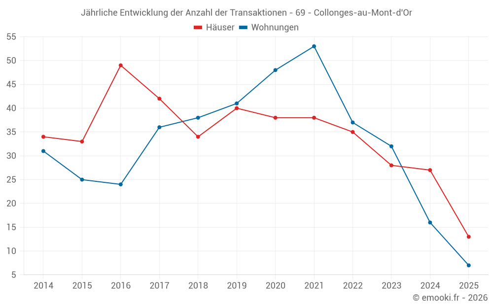 Der Durchschnittspreis auf den 28 Hausgeschäften der letzten 12 Monate in der Gemeinde Collonges-au-Mont-d'Or betrug 5 467 € pro Quadratmeter für einen mittleren Immobilienwert von 695 975 €. Über diesen Zeitraum hinweg lagen 60% der Transaktionen zwischen 3 312 und 7 192 € pro Quadratmeter (vom 2. bis zum 8. Dezil).