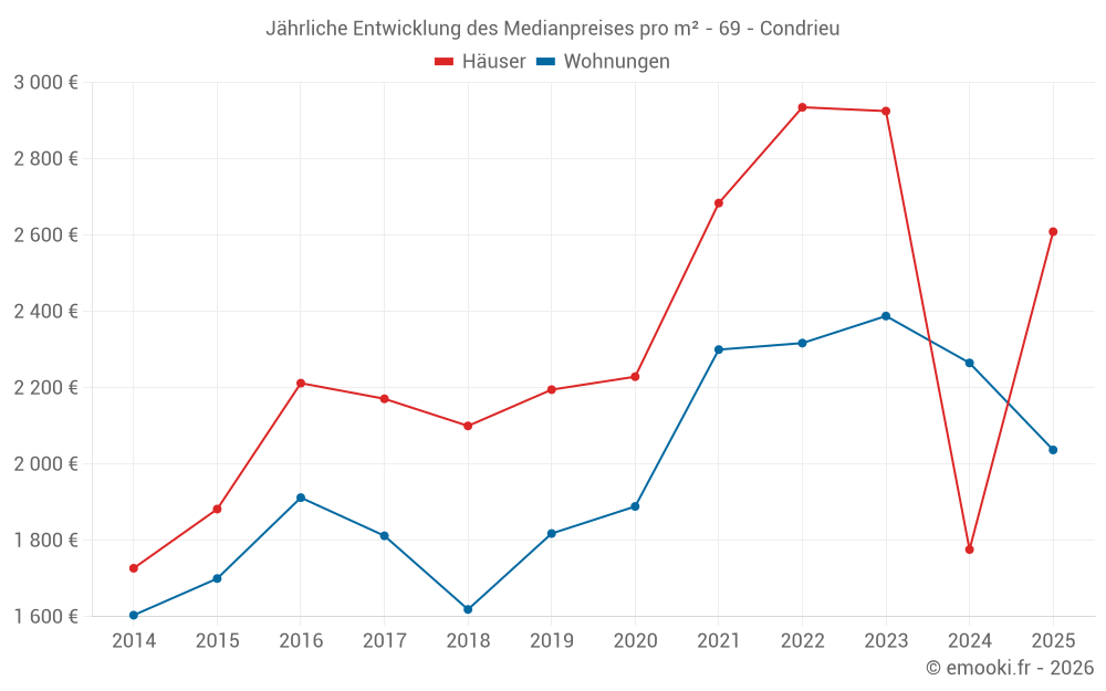 Der Durchschnittspreis auf den 19 Wohnungstransaktionen der letzten 12 Monate in der Gemeinde Condrieu betrug 2 037 € pro Quadratmeter für einen mittleren Immobilienwert von 163 100 €. Über diesen Zeitraum hinweg lagen 60% der Transaktionen zwischen 1 641 und 2 750 € pro Quadratmeter (vom 2. bis zum 8. Dezil).