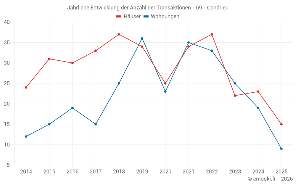 Der Durchschnittspreis auf den 27 Hausgeschäften der letzten 12 Monate in der Gemeinde Condrieu betrug 2 361 € pro Quadratmeter für einen mittleren Immobilienwert von 245 000 €. Über diesen Zeitraum hinweg lagen 60% der Transaktionen zwischen 1 547 und 3 496 € pro Quadratmeter (vom 2. bis zum 8. Dezil).