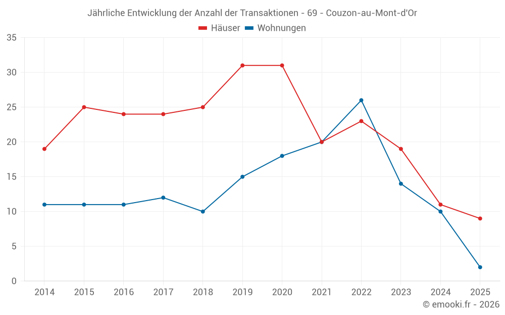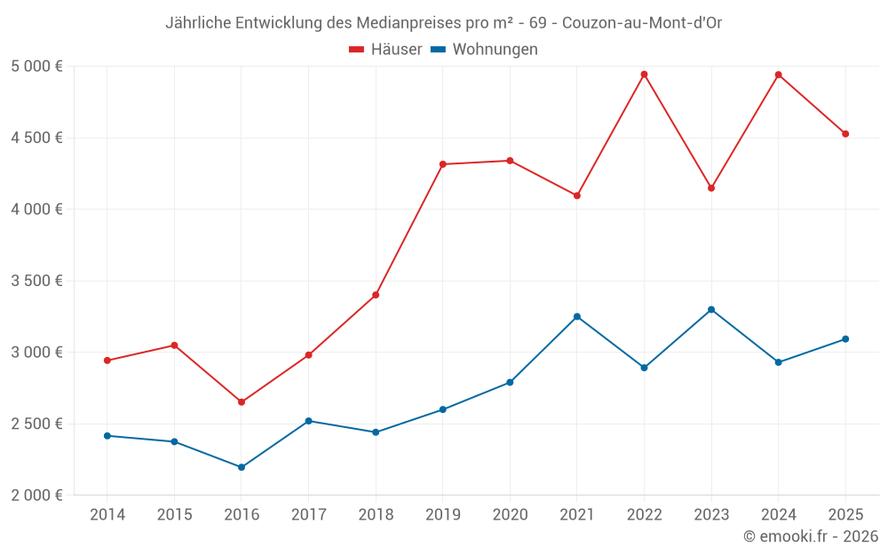 Der Durchschnittspreis auf den 27 Hausgeschäften der letzten 24 Monate in der Gemeinde Couzon-au-Mont-d'Or betrug 4 618 € pro Quadratmeter für einen mittleren Immobilienwert von 465 000 €. Über diesen Zeitraum hinweg lagen 60% der Transaktionen zwischen 3 088 und 5 556 € pro Quadratmeter (vom 2. bis zum 8. Dezil).