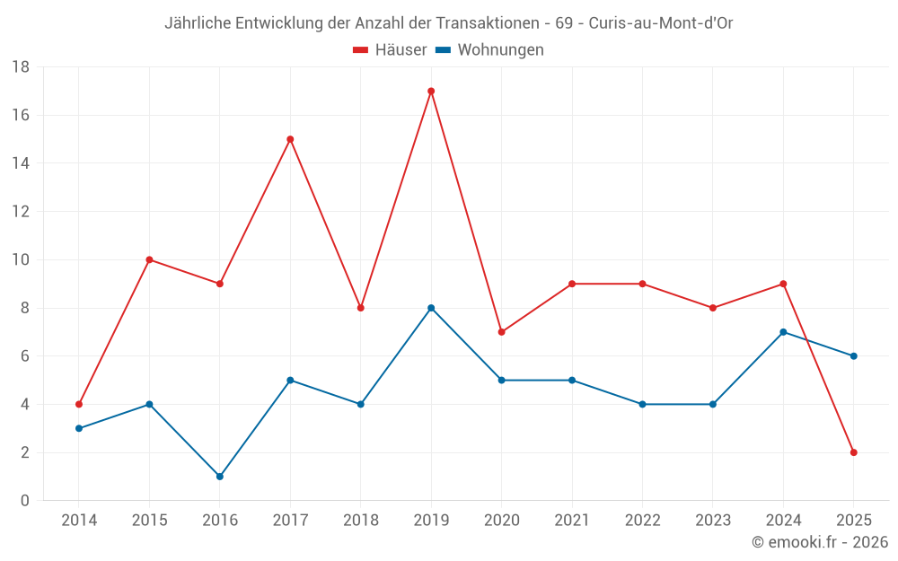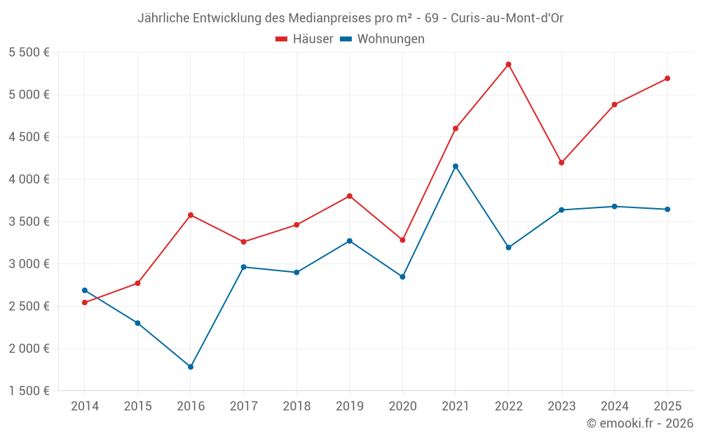 Der Durchschnittspreis auf den 15 Hausgeschäften der letzten 24 Monate in der Gemeinde Curis-au-Mont-d'Or betrug 4 542 € pro Quadratmeter für einen mittleren Immobilienwert von 604 800 €. Über diesen Zeitraum hinweg lagen 60% der Transaktionen zwischen 3 479 und 5 956 € pro Quadratmeter (vom 2. bis zum 8. Dezil).