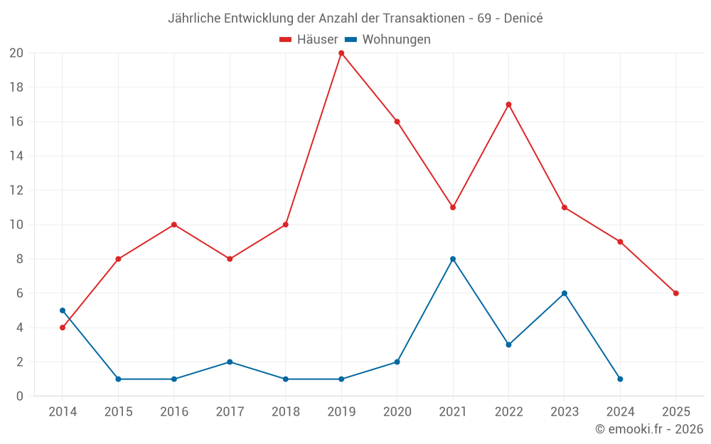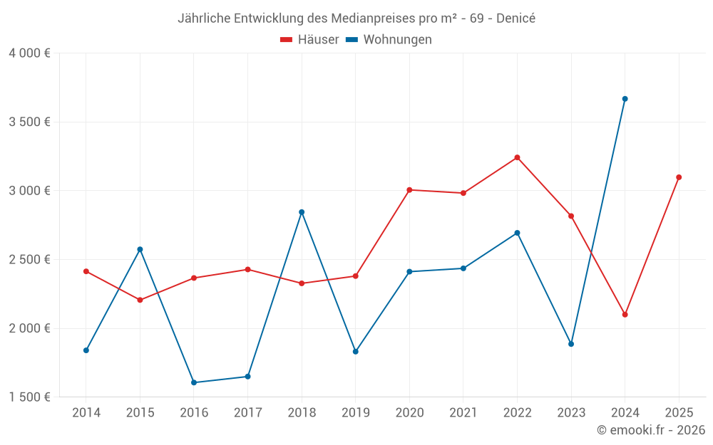 Der Durchschnittspreis auf den 22 Hausgeschäften der letzten 24 Monate in der Gemeinde Denicé betrug 2 688 € pro Quadratmeter für einen mittleren Immobilienwert von 252 500 €. Über diesen Zeitraum hinweg lagen 60% der Transaktionen zwischen 1 559 und 3 498 € pro Quadratmeter (vom 2. bis zum 8. Dezil).