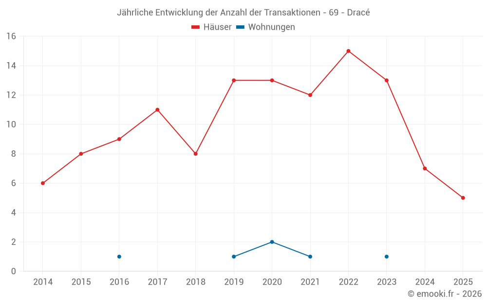 Der Durchschnittspreis auf den 20 Hausgeschäften der letzten 24 Monate in der Gemeinde Dracé betrug 2 917 € pro Quadratmeter für einen mittleren Immobilienwert von 290 000 €. Über diesen Zeitraum hinweg lagen 60% der Transaktionen zwischen 2 514 und 3 153 € pro Quadratmeter (vom 2. bis zum 8. Dezil).