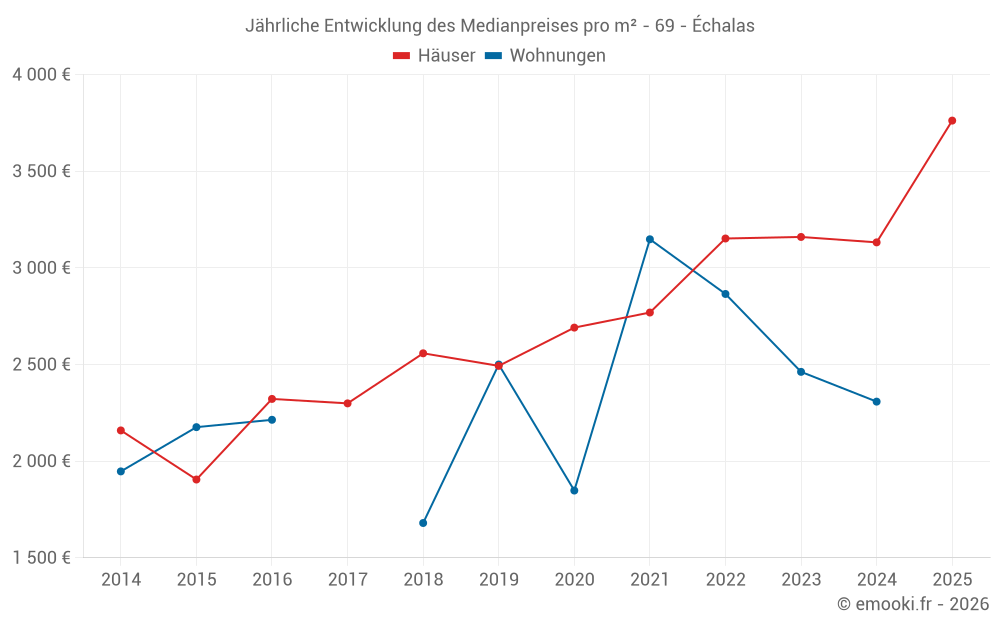 Der Durchschnittspreis auf den 21 Hausgeschäften der letzten 24 Monate in der Gemeinde Échalas betrug 3 148 € pro Quadratmeter für einen mittleren Immobilienwert von 293 650 €. Über diesen Zeitraum hinweg lagen 60% der Transaktionen zwischen 2 093 und 3 548 € pro Quadratmeter (vom 2. bis zum 8. Dezil).