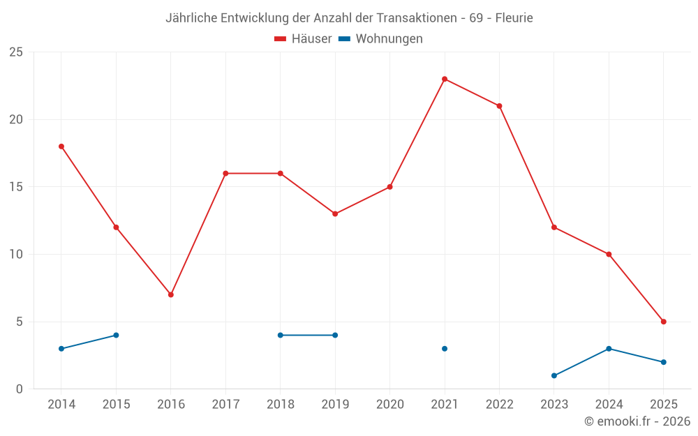 Der Durchschnittspreis auf den 20 Hausgeschäften der letzten 24 Monate in der Gemeinde Fleurie betrug 2 324 € pro Quadratmeter für einen mittleren Immobilienwert von 250 000 €. Über diesen Zeitraum hinweg lagen 60% der Transaktionen zwischen 1 578 und 3 166 € pro Quadratmeter (vom 2. bis zum 8. Dezil).
