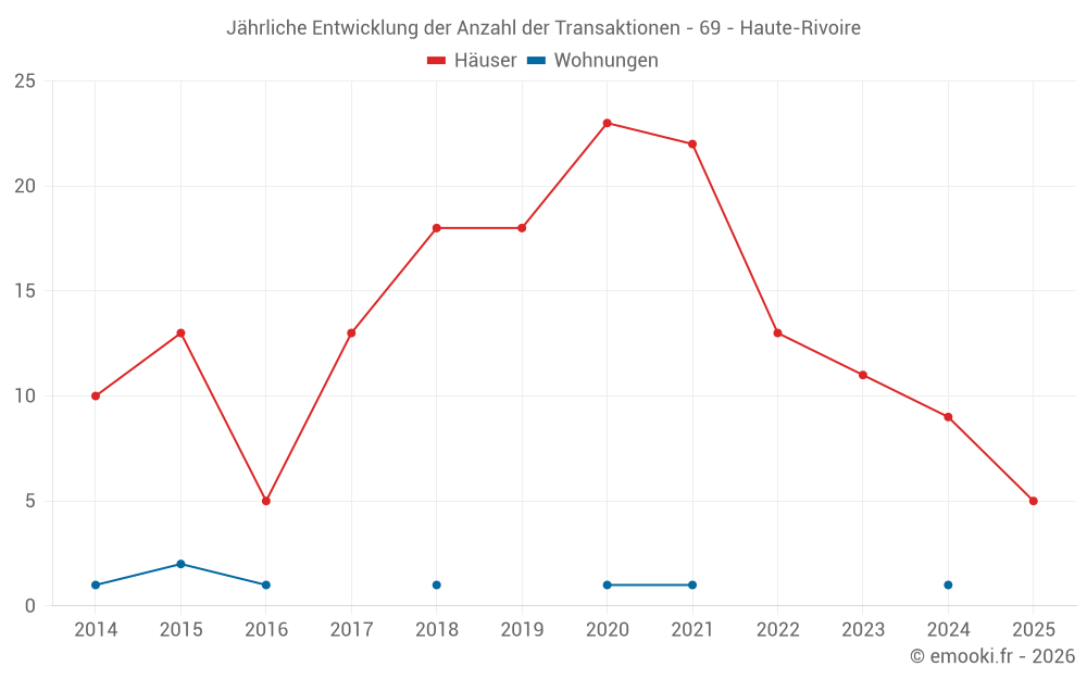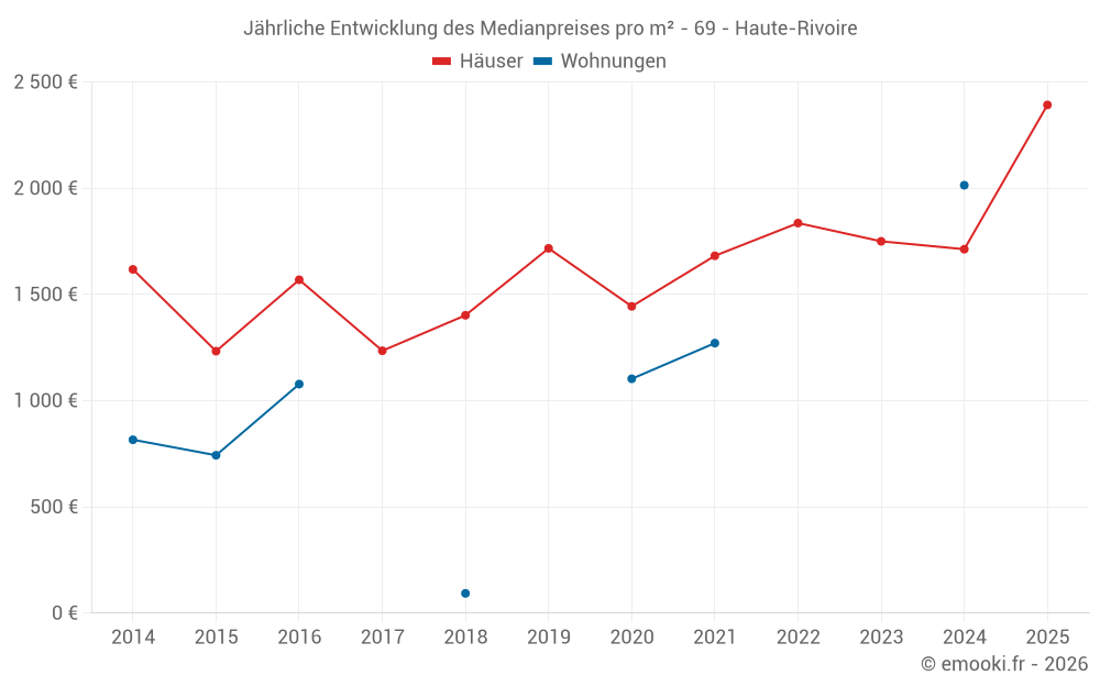Der Durchschnittspreis auf den 20 Hausgeschäften der letzten 24 Monate in der Gemeinde Haute-Rivoire betrug 1 793 € pro Quadratmeter für einen mittleren Immobilienwert von 216 750 €. Über diesen Zeitraum hinweg lagen 60% der Transaktionen zwischen 1 396 und 2 422 € pro Quadratmeter (vom 2. bis zum 8. Dezil).
