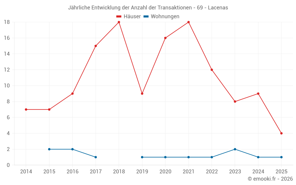 Der Durchschnittspreis auf den 17 Hausgeschäften der letzten 24 Monate in der Gemeinde Lacenas betrug 3 211 € pro Quadratmeter für einen mittleren Immobilienwert von 355 000 €. Über diesen Zeitraum hinweg lagen 60% der Transaktionen zwischen 2 158 und 4 009 € pro Quadratmeter (vom 2. bis zum 8. Dezil).