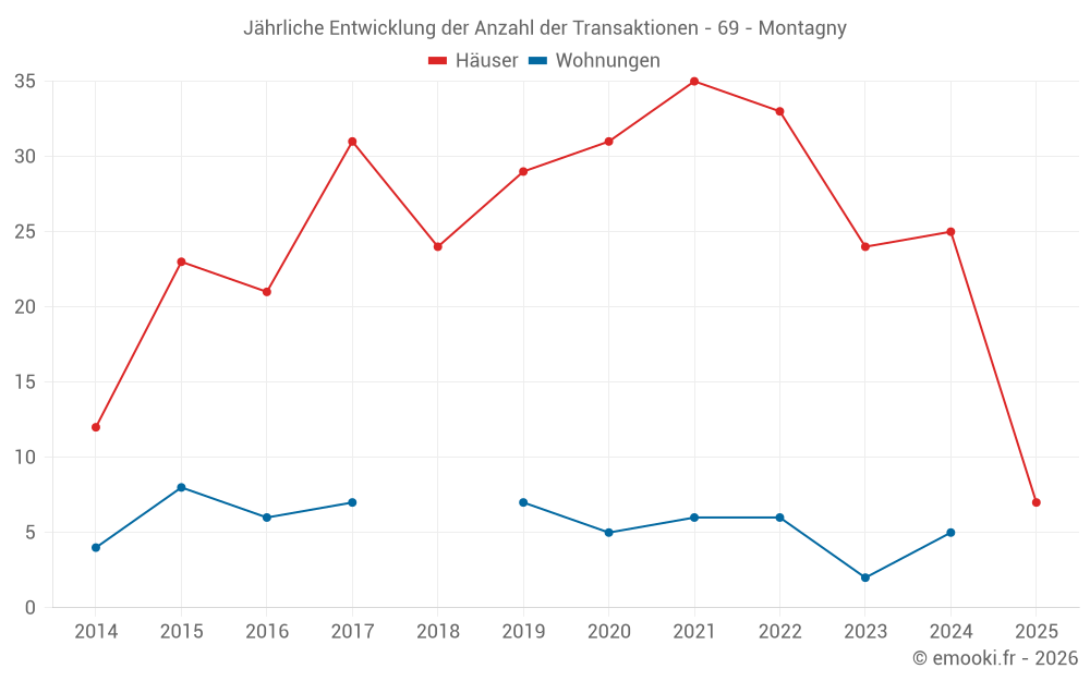 Der Durchschnittspreis auf den 22 Hausgeschäften der letzten 12 Monate in der Gemeinde Montagny betrug 4 006 € pro Quadratmeter für einen mittleren Immobilienwert von 423 575 €. Über diesen Zeitraum hinweg lagen 60% der Transaktionen zwischen 3 541 und 4 582 € pro Quadratmeter (vom 2. bis zum 8. Dezil).