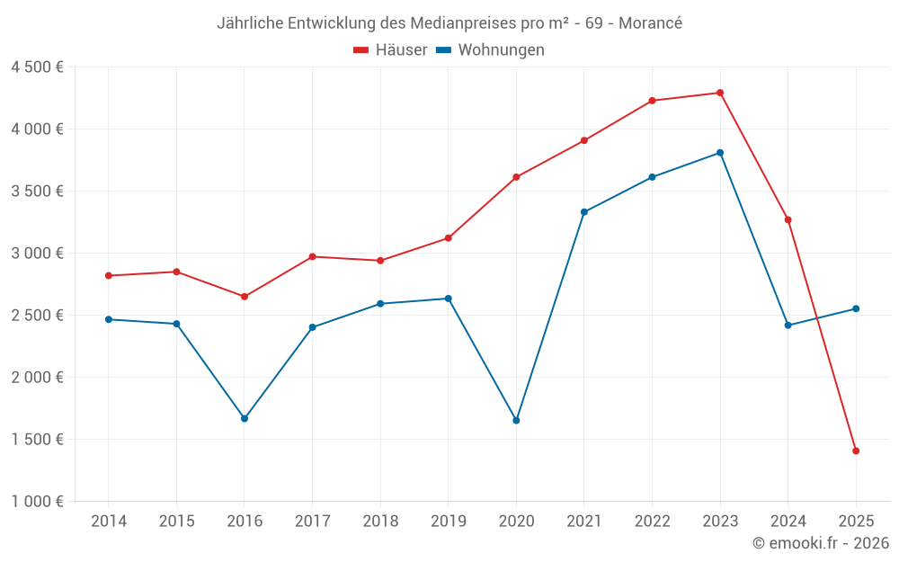 Der Durchschnittspreis auf den 26 Hausgeschäften der letzten 24 Monate in der Gemeinde Morancé betrug 3 444 € pro Quadratmeter für einen mittleren Immobilienwert von 426 500 €. Über diesen Zeitraum hinweg lagen 60% der Transaktionen zwischen 2 746 und 4 555 € pro Quadratmeter (vom 2. bis zum 8. Dezil).
