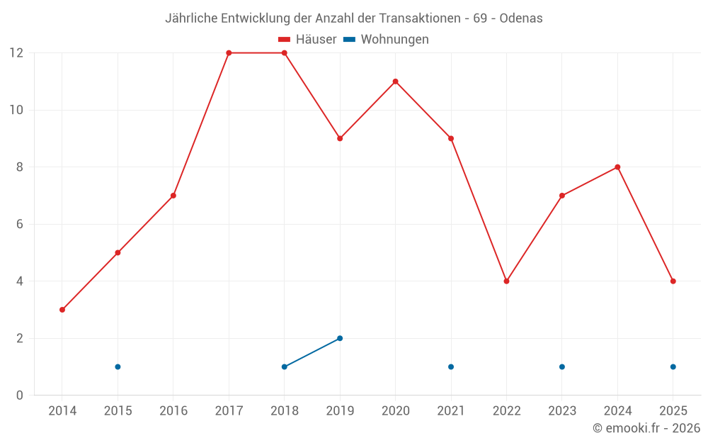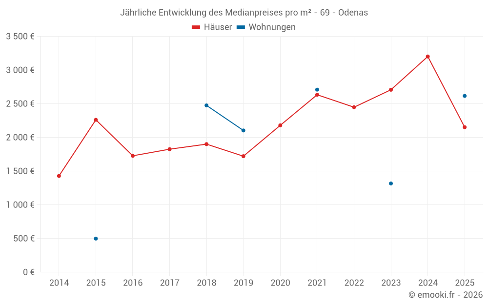 Der Durchschnittspreis auf den 15 Hausgeschäften der letzten 24 Monate in der Gemeinde Odenas betrug 2 611 € pro Quadratmeter für einen mittleren Immobilienwert von 345 150 €. Über diesen Zeitraum hinweg lagen 60% der Transaktionen zwischen 1 829 und 3 451 € pro Quadratmeter (vom 2. bis zum 8. Dezil).