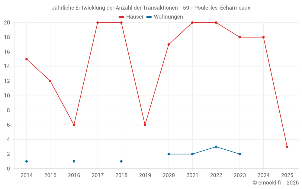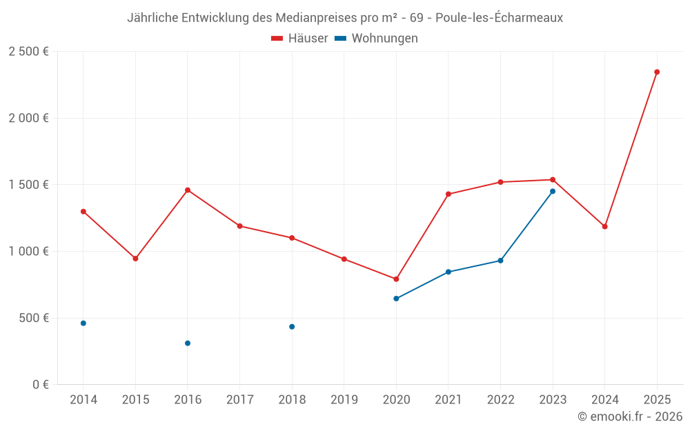 Der Durchschnittspreis auf den 29 Hausgeschäften der letzten 24 Monate in der Gemeinde Poule-les-Écharmeaux betrug 1 250 € pro Quadratmeter für einen mittleren Immobilienwert von 172 000 €. Über diesen Zeitraum hinweg lagen 60% der Transaktionen zwischen 886 und 2 019 € pro Quadratmeter (vom 2. bis zum 8. Dezil).