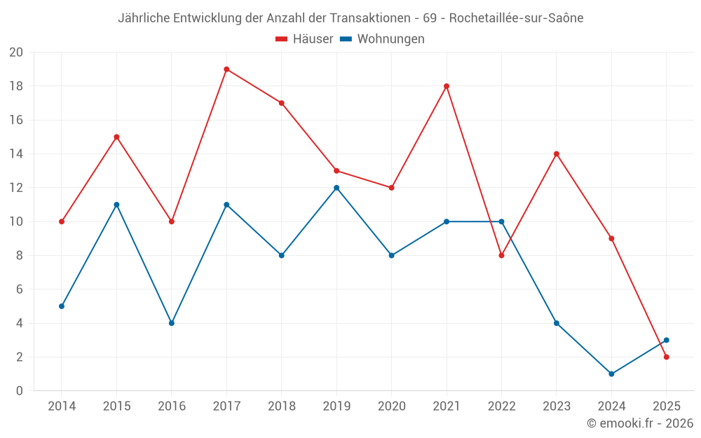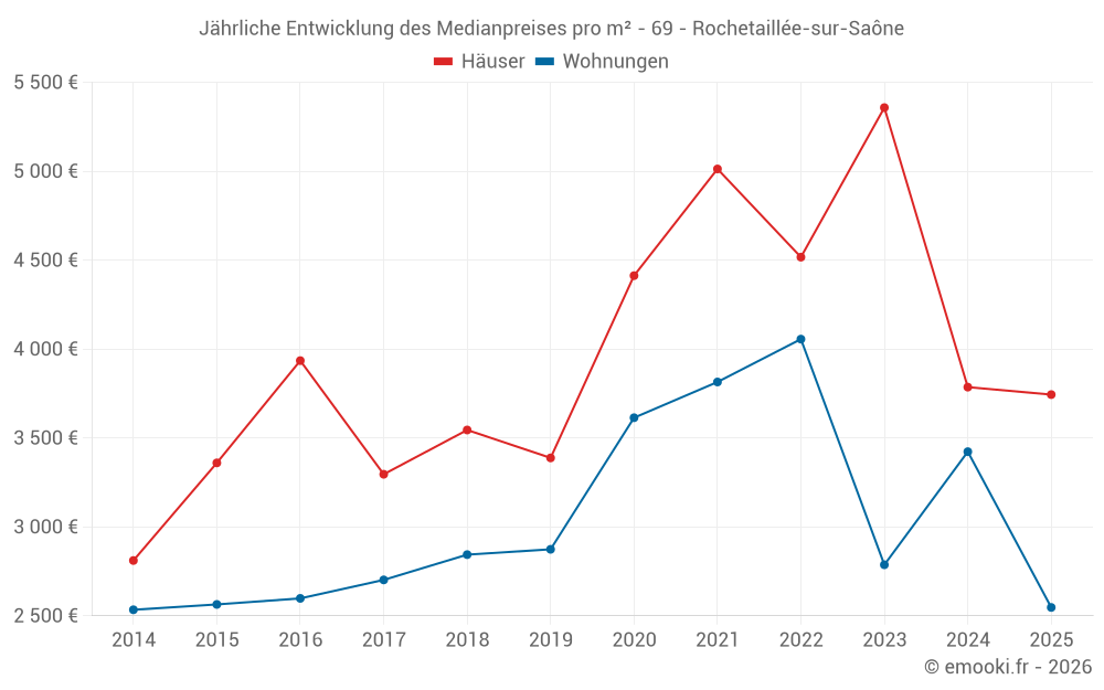 Der Durchschnittspreis auf den 15 Hausgeschäften der letzten 24 Monate in der Gemeinde Rochetaillée-sur-Saône betrug 4 867 € pro Quadratmeter für einen mittleren Immobilienwert von 486 000 €. Über diesen Zeitraum hinweg lagen 60% der Transaktionen zwischen 2 522 und 6 245 € pro Quadratmeter (vom 2. bis zum 8. Dezil).