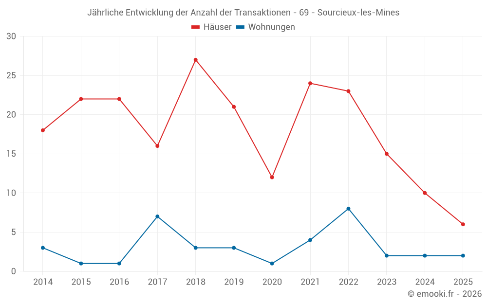 Der Durchschnittspreis auf den 22 Hausgeschäften der letzten 24 Monate in der Gemeinde Sourcieux-les-Mines betrug 3 506 € pro Quadratmeter für einen mittleren Immobilienwert von 292 825 €. Über diesen Zeitraum hinweg lagen 60% der Transaktionen zwischen 2 745 und 4 304 € pro Quadratmeter (vom 2. bis zum 8. Dezil).