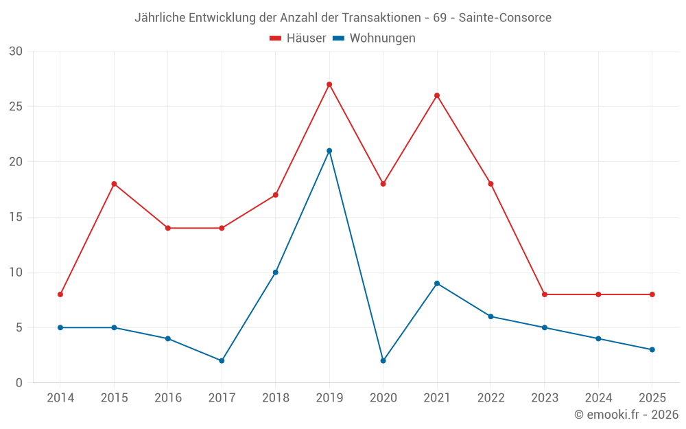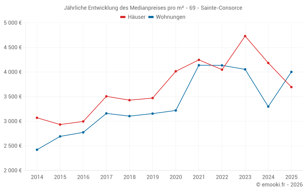Der Durchschnittspreis auf den 20 Hausgeschäften der letzten 24 Monate in der Gemeinde Sainte-Consorce betrug 3 954 € pro Quadratmeter für einen mittleren Immobilienwert von 438 515 €. Über diesen Zeitraum hinweg lagen 60% der Transaktionen zwischen 2 937 und 4 668 € pro Quadratmeter (vom 2. bis zum 8. Dezil).