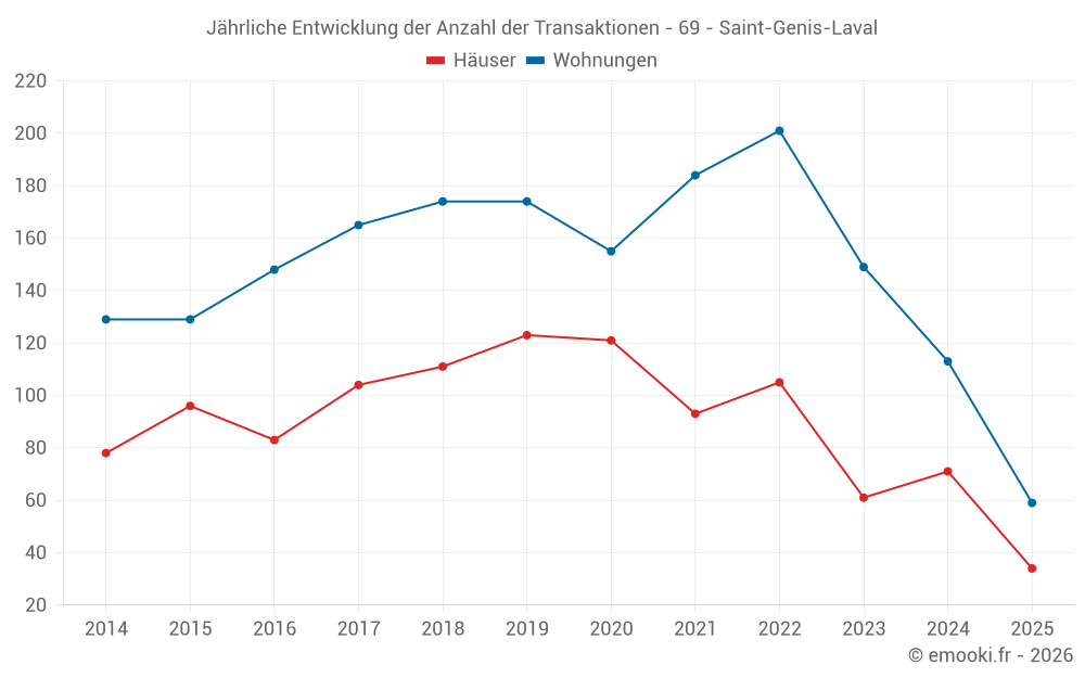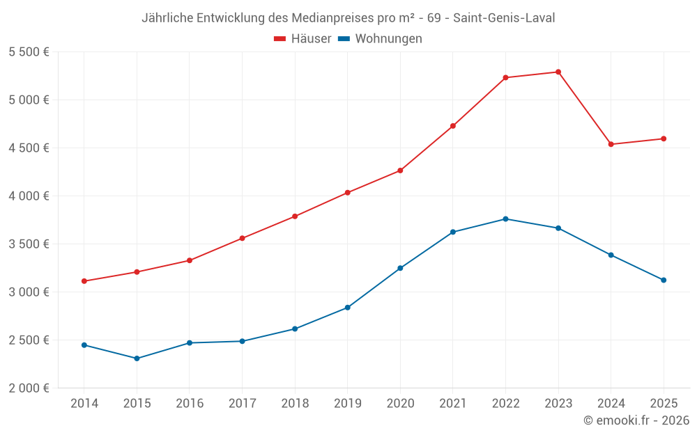Der Durchschnittspreis auf den 34 Hausgeschäften der letzten 6 Monate in der Gemeinde Saint-Genis-Laval betrug 4 597 € pro Quadratmeter für einen mittleren Immobilienwert von 476 175 €. Über diesen Zeitraum hinweg lagen 60% der Transaktionen zwischen 3 741 und 5 346 € pro Quadratmeter (vom 2. bis zum 8. Dezil).