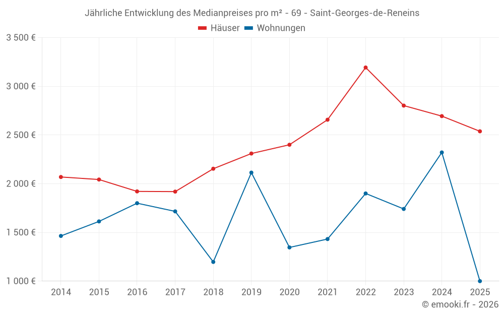 Der Durchschnittspreis auf den 17 Wohnungstransaktionen der letzten 24 Monate in der Gemeinde Saint-Georges-de-Reneins betrug 2 277 € pro Quadratmeter für einen mittleren Immobilienwert von 200 000 €. Über diesen Zeitraum hinweg lagen 60% der Transaktionen zwischen 1 439 und 2 520 € pro Quadratmeter (vom 2. bis zum 8. Dezil).