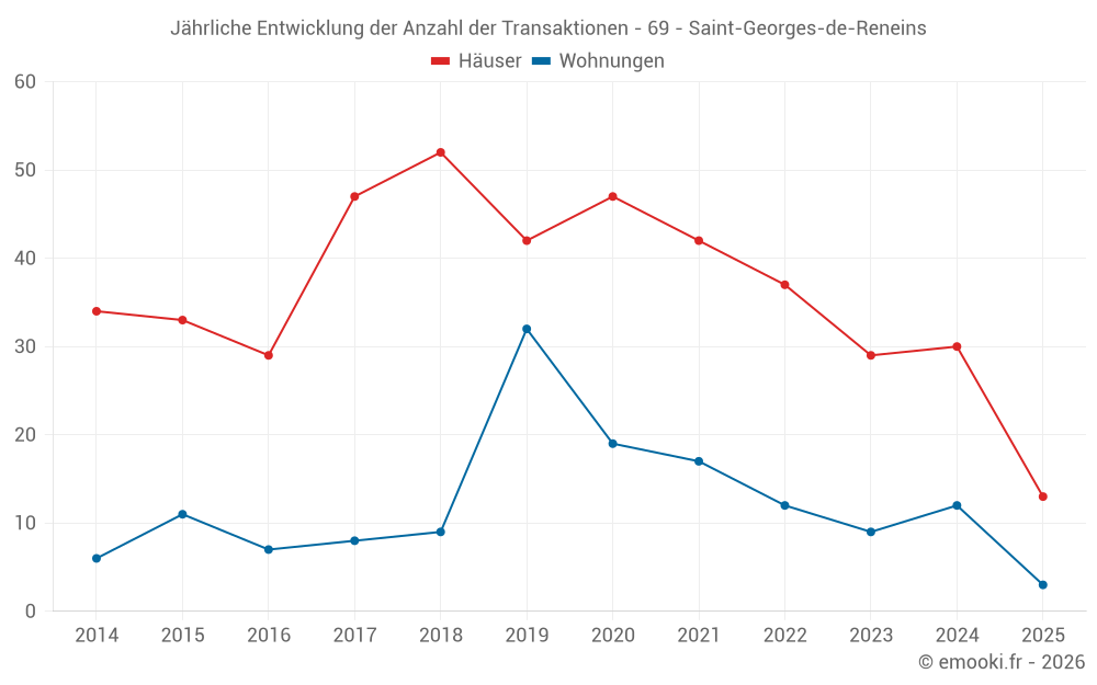 Der Durchschnittspreis auf den 30 Hausgeschäften der letzten 12 Monate in der Gemeinde Saint-Georges-de-Reneins betrug 2 850 € pro Quadratmeter für einen mittleren Immobilienwert von 294 902 €. Über diesen Zeitraum hinweg lagen 60% der Transaktionen zwischen 2 427 und 3 398 € pro Quadratmeter (vom 2. bis zum 8. Dezil).