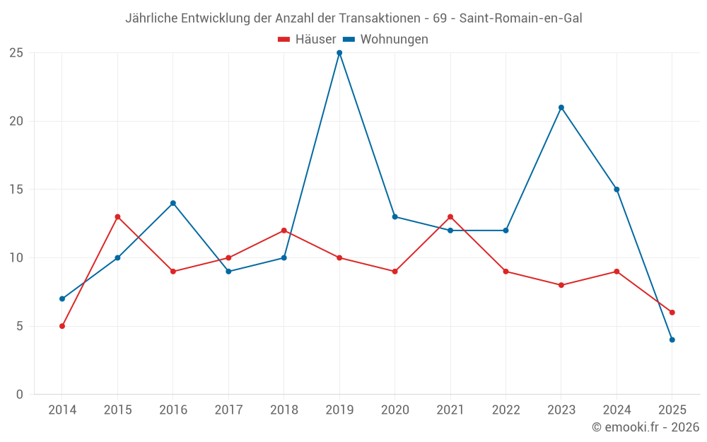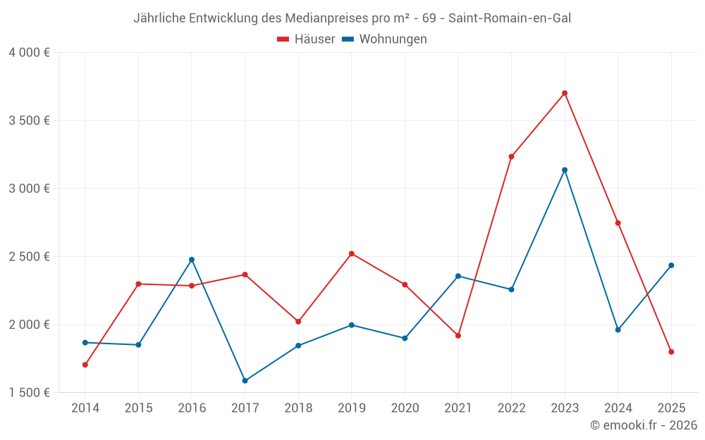 Der Durchschnittspreis auf den 28 Wohnungstransaktionen der letzten 24 Monate in der Gemeinde Saint-Romain-en-Gal betrug 2 526 € pro Quadratmeter für einen mittleren Immobilienwert von 166 250 €. Über diesen Zeitraum hinweg lagen 60% der Transaktionen zwischen 1 816 und 3 710 € pro Quadratmeter (vom 2. bis zum 8. Dezil).