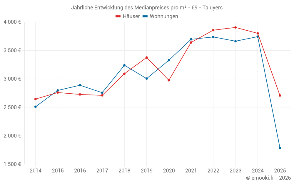 Der Durchschnittspreis auf den 19 Hausgeschäften der letzten 24 Monate in der Gemeinde Taluyers betrug 3 218 € pro Quadratmeter für einen mittleren Immobilienwert von 427 000 €. Über diesen Zeitraum hinweg lagen 60% der Transaktionen zwischen 2 266 und 4 690 € pro Quadratmeter (vom 2. bis zum 8. Dezil).