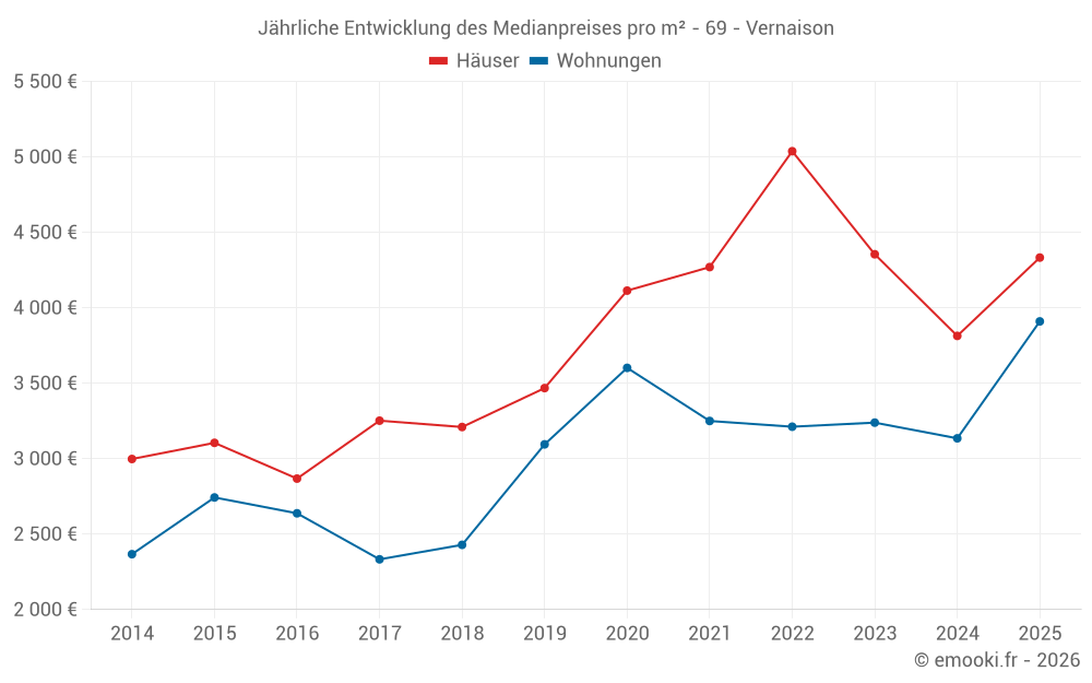 Der Durchschnittspreis auf den 22 Wohnungstransaktionen der letzten 12 Monate in der Gemeinde Vernaison betrug 3 483 € pro Quadratmeter für einen mittleren Immobilienwert von 163 000 €. Über diesen Zeitraum hinweg lagen 60% der Transaktionen zwischen 2 898 und 4 149 € pro Quadratmeter (vom 2. bis zum 8. Dezil).