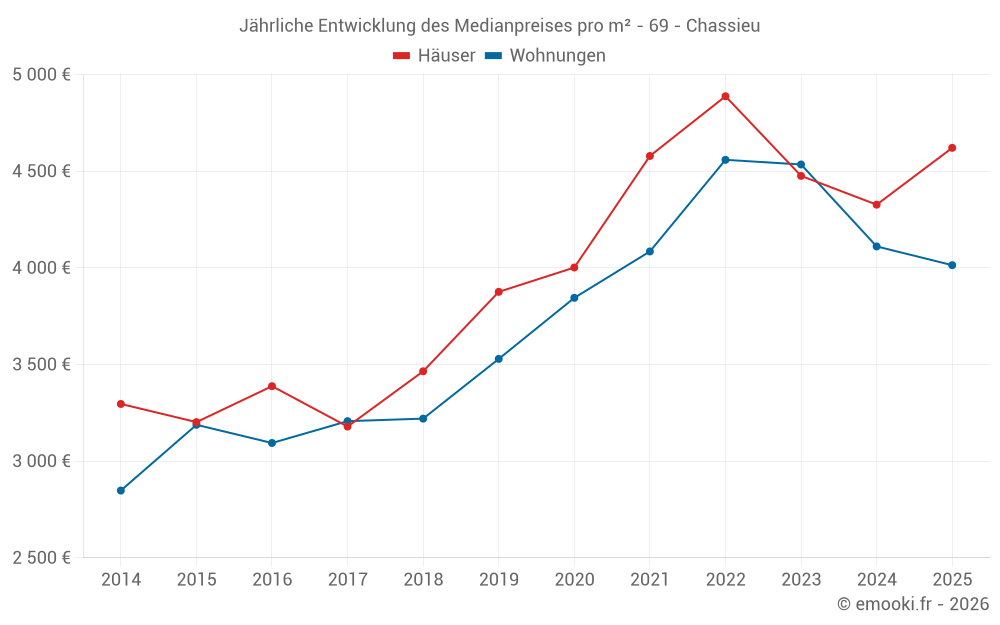 Der Durchschnittspreis auf den 18 Wohnungstransaktionen der letzten 6 Monate in der Gemeinde Chassieu betrug 4 014 € pro Quadratmeter für einen mittleren Immobilienwert von 194 770 €. Über diesen Zeitraum hinweg lagen 60% der Transaktionen zwischen 2 437 und 4 625 € pro Quadratmeter (vom 2. bis zum 8. Dezil).