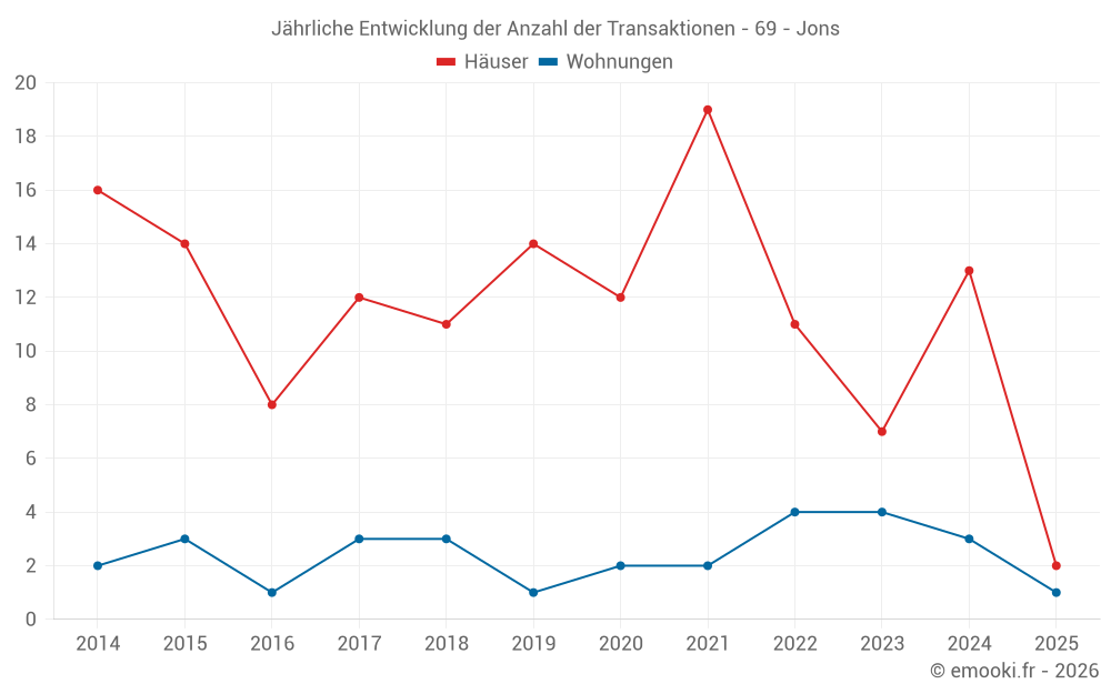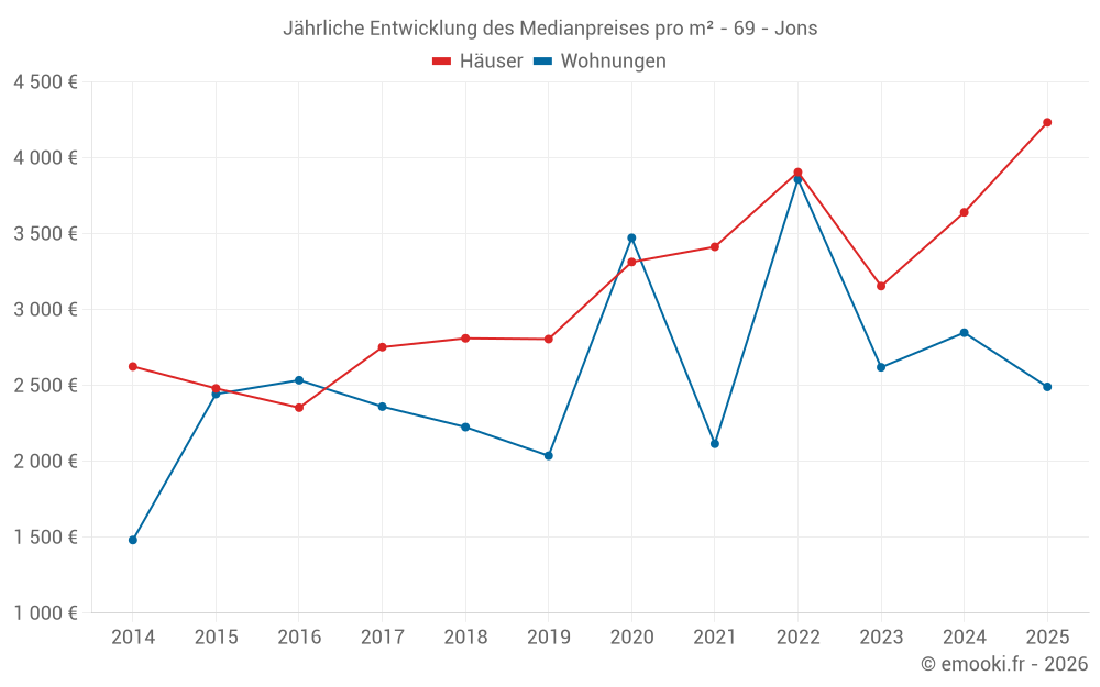 Der Durchschnittspreis auf den 20 Hausgeschäften der letzten 24 Monate in der Gemeinde Jons betrug 3 202 € pro Quadratmeter für einen mittleren Immobilienwert von 376 825 €. Über diesen Zeitraum hinweg lagen 60% der Transaktionen zwischen 2 684 und 4 759 € pro Quadratmeter (vom 2. bis zum 8. Dezil).