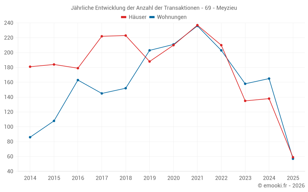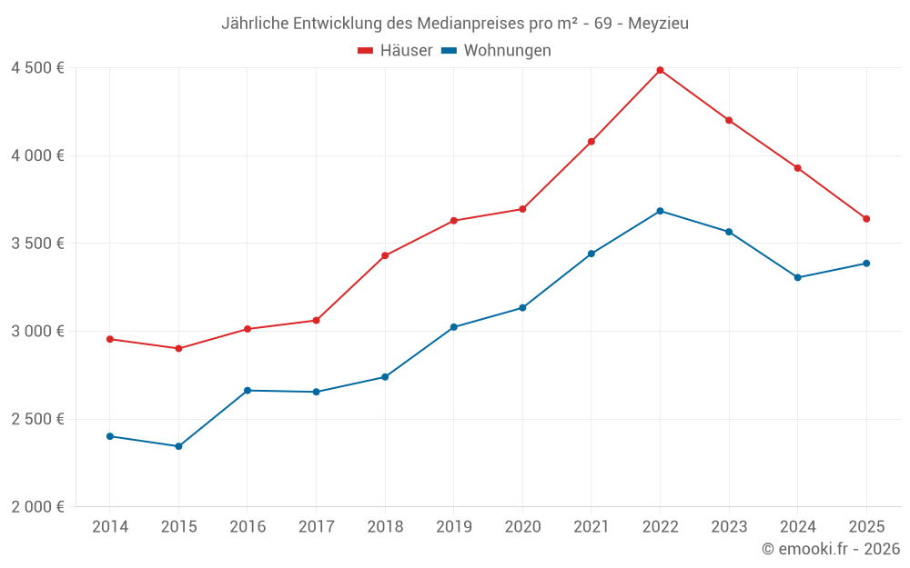 Der Durchschnittspreis auf den 22 Wohnungstransaktionen der letzten 3 Monate in der Gemeinde Meyzieu betrug 3 431 € pro Quadratmeter für einen mittleren Immobilienwert von 168 615 €. Über diesen Zeitraum hinweg lagen 60% der Transaktionen zwischen 2 811 und 3 962 € pro Quadratmeter (vom 2. bis zum 8. Dezil).