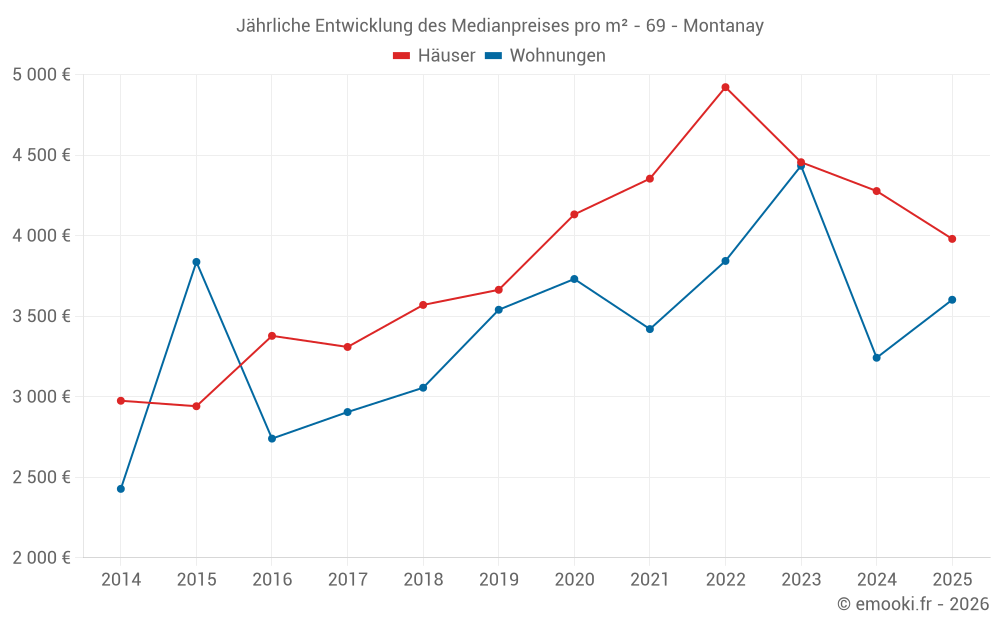Der Durchschnittspreis auf den 30 Hausgeschäften der letzten 12 Monate in der Gemeinde Montanay betrug 4 276 € pro Quadratmeter für einen mittleren Immobilienwert von 486 750 €. Über diesen Zeitraum hinweg lagen 60% der Transaktionen zwischen 3 541 und 5 586 € pro Quadratmeter (vom 2. bis zum 8. Dezil).