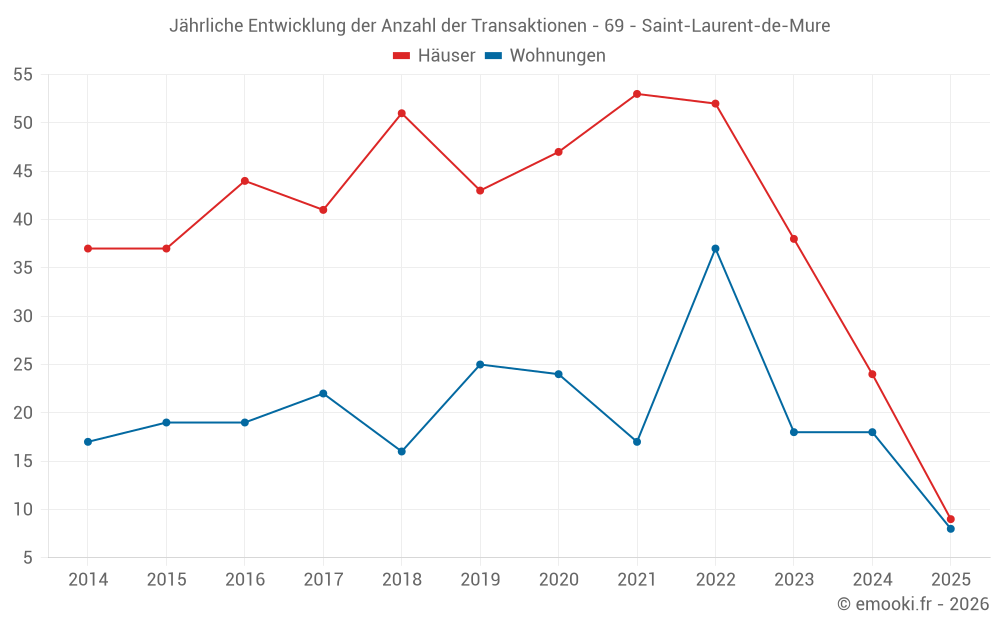 Der Durchschnittspreis auf den 19 Wohnungstransaktionen der letzten 12 Monate in der Gemeinde Saint-Laurent-de-Mure betrug 3 714 € pro Quadratmeter für einen mittleren Immobilienwert von 210 000 €. Über diesen Zeitraum hinweg lagen 60% der Transaktionen zwischen 3 002 und 4 642 € pro Quadratmeter (vom 2. bis zum 8. Dezil).