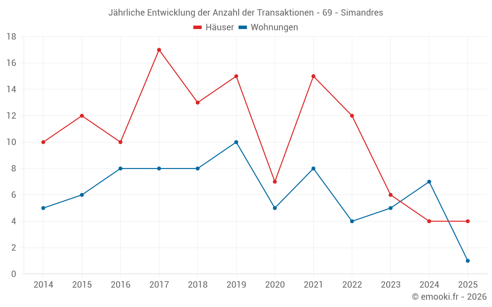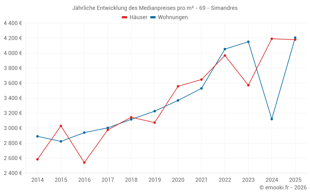 Der Preis pro m² von Häusern ist seit 1 Jahr um 0.3% gesunken, aber er ist in 9 Jahren um 65% gestiegen.