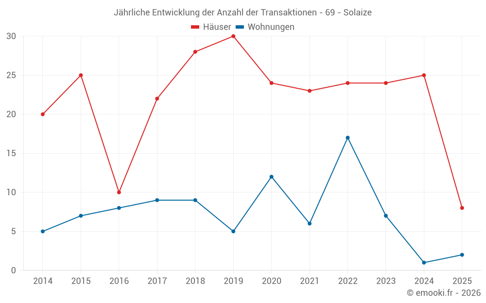 Der Durchschnittspreis auf den 23 Hausgeschäften der letzten 12 Monate in der Gemeinde Solaize betrug 3 724 € pro Quadratmeter für einen mittleren Immobilienwert von 388 000 €. Über diesen Zeitraum hinweg lagen 60% der Transaktionen zwischen 2 316 und 4 298 € pro Quadratmeter (vom 2. bis zum 8. Dezil).