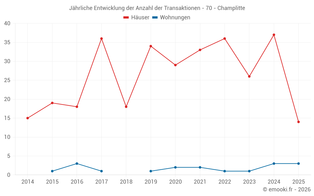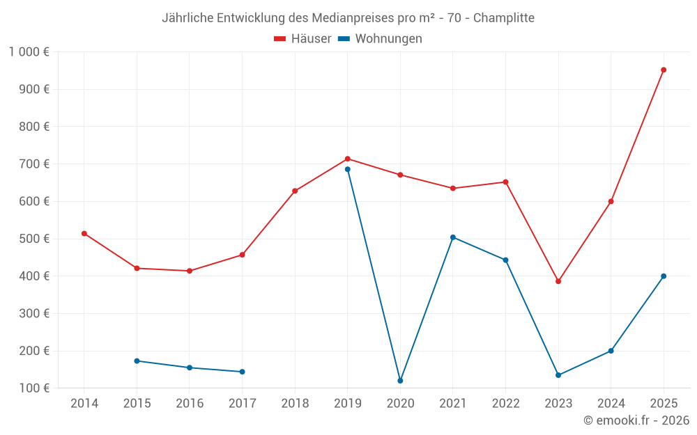 Der Durchschnittspreis auf den 32 Hausgeschäften der letzten 12 Monate in der Gemeinde Champlitte betrug 895 € pro Quadratmeter für einen mittleren Immobilienwert von 72 000 €. Über diesen Zeitraum hinweg lagen 60% der Transaktionen zwischen 381 und 1 353 € pro Quadratmeter (vom 2. bis zum 8. Dezil).
