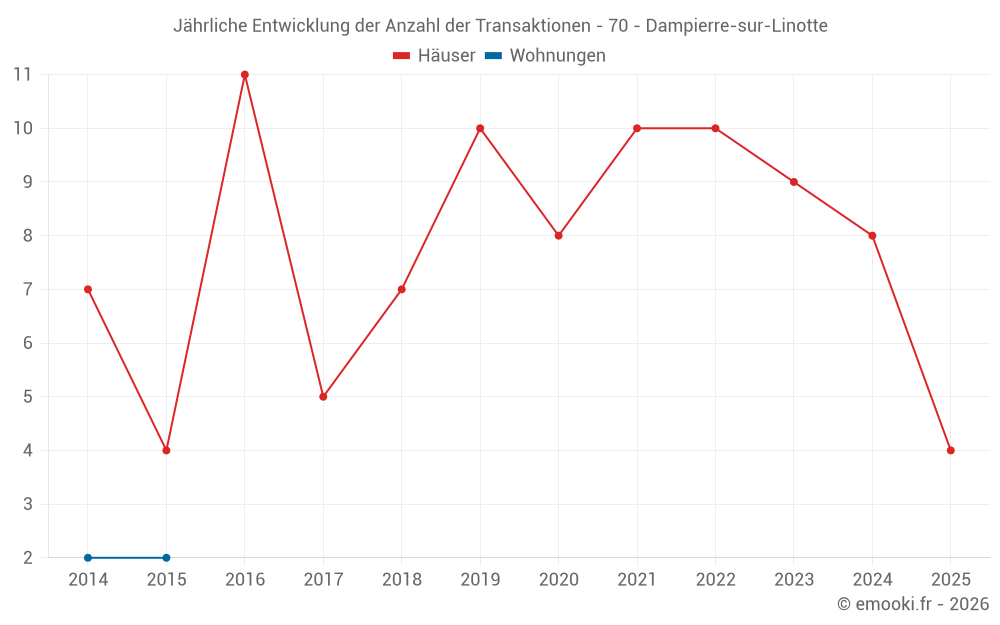 Der Durchschnittspreis auf den 15 Hausgeschäften der letzten 24 Monate in der Gemeinde Dampierre-sur-Linotte betrug 833 € pro Quadratmeter für einen mittleren Immobilienwert von 69 000 €. Über diesen Zeitraum hinweg lagen 60% der Transaktionen zwischen 428 und 1 332 € pro Quadratmeter (vom 2. bis zum 8. Dezil).
