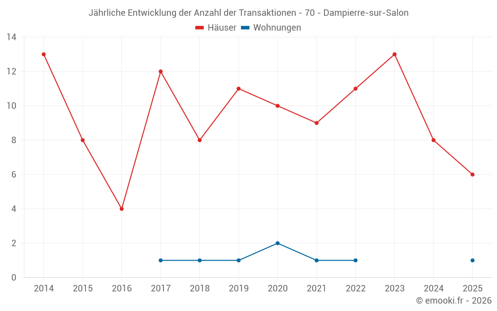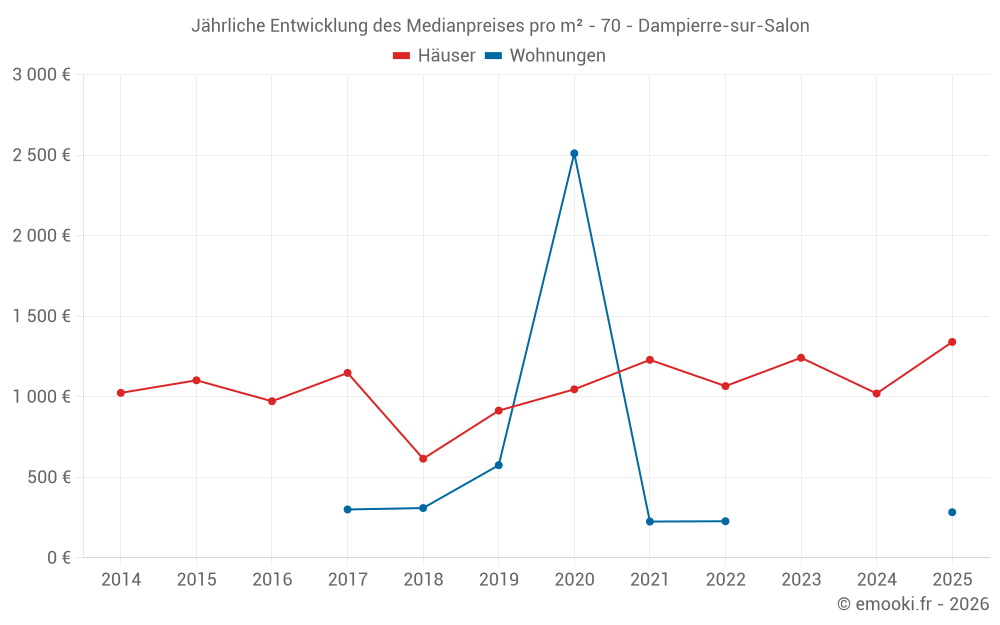 Der Durchschnittspreis auf den 19 Hausgeschäften der letzten 24 Monate in der Gemeinde Dampierre-sur-Salon betrug 1 263 € pro Quadratmeter für einen mittleren Immobilienwert von 119 000 €. Über diesen Zeitraum hinweg lagen 60% der Transaktionen zwischen 763 und 1 439 € pro Quadratmeter (vom 2. bis zum 8. Dezil).