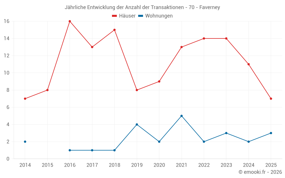 Der Durchschnittspreis auf den 18 Hausgeschäften der letzten 24 Monate in der Gemeinde Faverney betrug 768 € pro Quadratmeter für einen mittleren Immobilienwert von 88 000 €. Über diesen Zeitraum hinweg lagen 60% der Transaktionen zwischen 202 und 1 316 € pro Quadratmeter (vom 2. bis zum 8. Dezil).