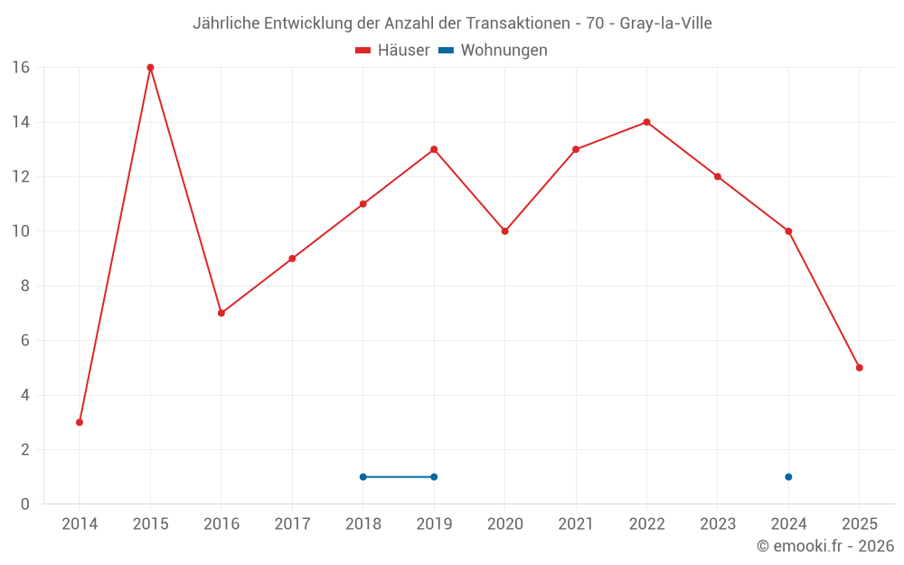 Der Durchschnittspreis auf den 20 Hausgeschäften der letzten 24 Monate in der Gemeinde Gray-la-Ville betrug 1 418 € pro Quadratmeter für einen mittleren Immobilienwert von 152 000 €. Über diesen Zeitraum hinweg lagen 60% der Transaktionen zwischen 886 und 1 714 € pro Quadratmeter (vom 2. bis zum 8. Dezil).