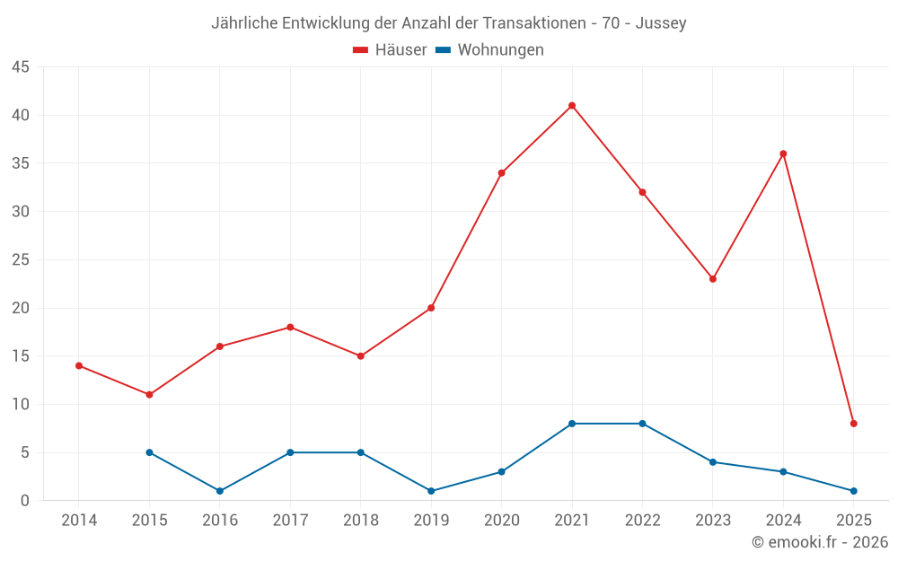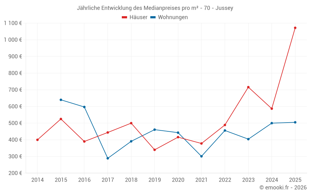 Der Durchschnittspreis auf den 26 Hausgeschäften der letzten 12 Monate in der Gemeinde Jussey betrug 752 € pro Quadratmeter für einen mittleren Immobilienwert von 66 750 €. Über diesen Zeitraum hinweg lagen 60% der Transaktionen zwischen 286 und 1 346 € pro Quadratmeter (vom 2. bis zum 8. Dezil).