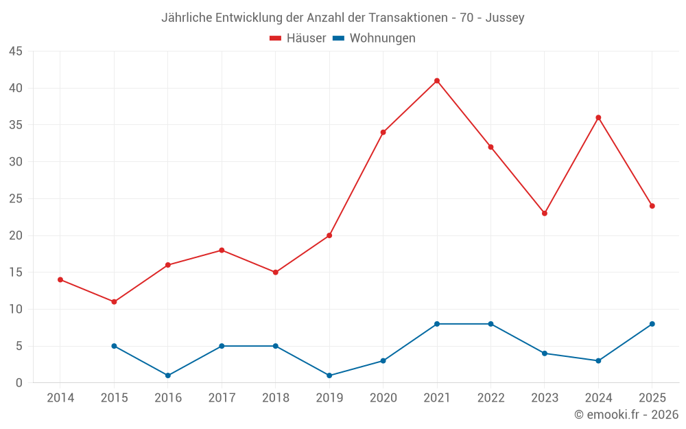 Der Durchschnittspreis auf den 24 Hausgeschäften der letzten 12 Monate in der Gemeinde Jussey betrug 694 € pro Quadratmeter für einen mittleren Immobilienwert von 70 150 €. Über diesen Zeitraum hinweg lagen 60% der Transaktionen zwischen 370 und 1 355 € pro Quadratmeter (vom 2. bis zum 8. Dezil).
