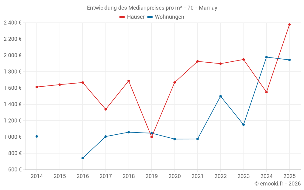 Der Durchschnittspreis auf den 20 Hausgeschäften der letzten 24 Monate in der Gemeinde Marnay betrug 1 806 € pro Quadratmeter für einen mittleren Immobilienwert von 188 225 €. Über diesen Zeitraum hinweg lagen 60% der Transaktionen zwischen 1 250 und 2 399 € pro Quadratmeter (vom 2. bis zum 8. Dezil).