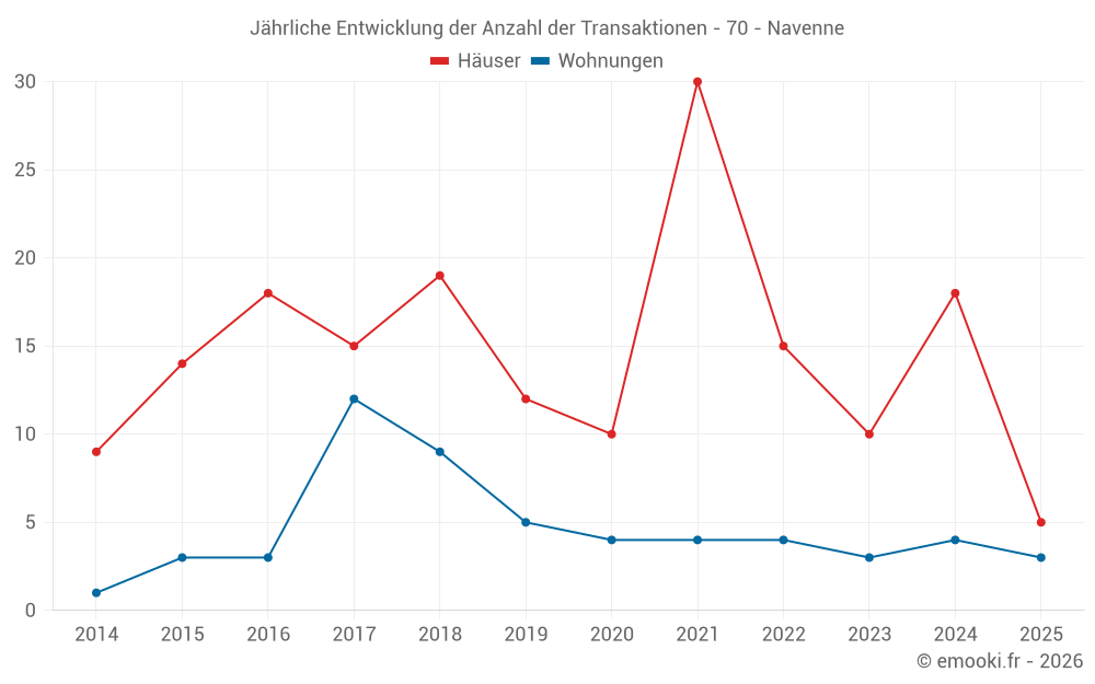 Der Durchschnittspreis auf den 24 Hausgeschäften der letzten 24 Monate in der Gemeinde Navenne betrug 1 526 € pro Quadratmeter für einen mittleren Immobilienwert von 159 250 €. Über diesen Zeitraum hinweg lagen 60% der Transaktionen zwischen 1 249 und 2 059 € pro Quadratmeter (vom 2. bis zum 8. Dezil).