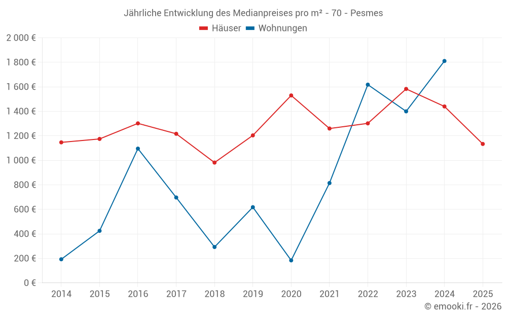 Der Durchschnittspreis auf den 29 Hausgeschäften der letzten 24 Monate in der Gemeinde Pesmes betrug 1 489 € pro Quadratmeter für einen mittleren Immobilienwert von 121 400 €. Über diesen Zeitraum hinweg lagen 60% der Transaktionen zwischen 820 und 1 754 € pro Quadratmeter (vom 2. bis zum 8. Dezil).