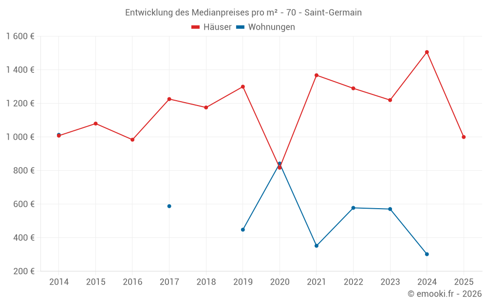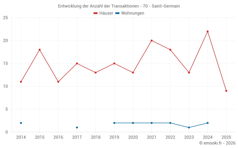 Der Durchschnittspreis auf den 23 Hausgeschäften der letzten 12 Monate in der Gemeinde Saint-Germain betrug 1 483 € pro Quadratmeter für einen mittleren Immobilienwert von 137 800 €. Über diesen Zeitraum hinweg lagen 60% der Transaktionen zwischen 844 und 1 832 € pro Quadratmeter (vom 2. bis zum 8. Dezil).