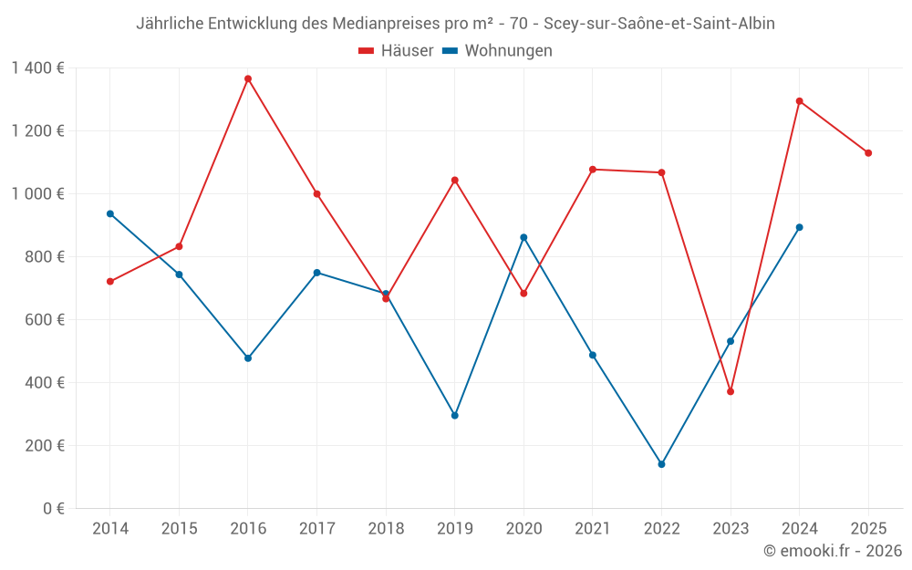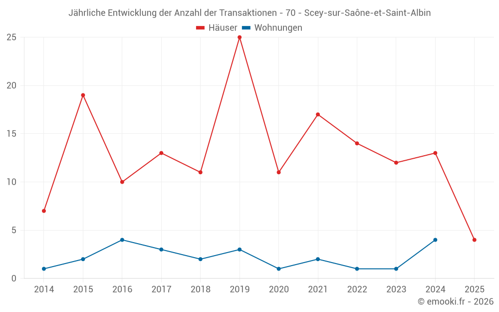 Der Durchschnittspreis auf den 23 Hausgeschäften der letzten 24 Monate in der Gemeinde Scey-sur-Saône-et-Saint-Albin betrug 835 € pro Quadratmeter für einen mittleren Immobilienwert von 113 700 €. Über diesen Zeitraum hinweg lagen 60% der Transaktionen zwischen 298 und 1 456 € pro Quadratmeter (vom 2. bis zum 8. Dezil).