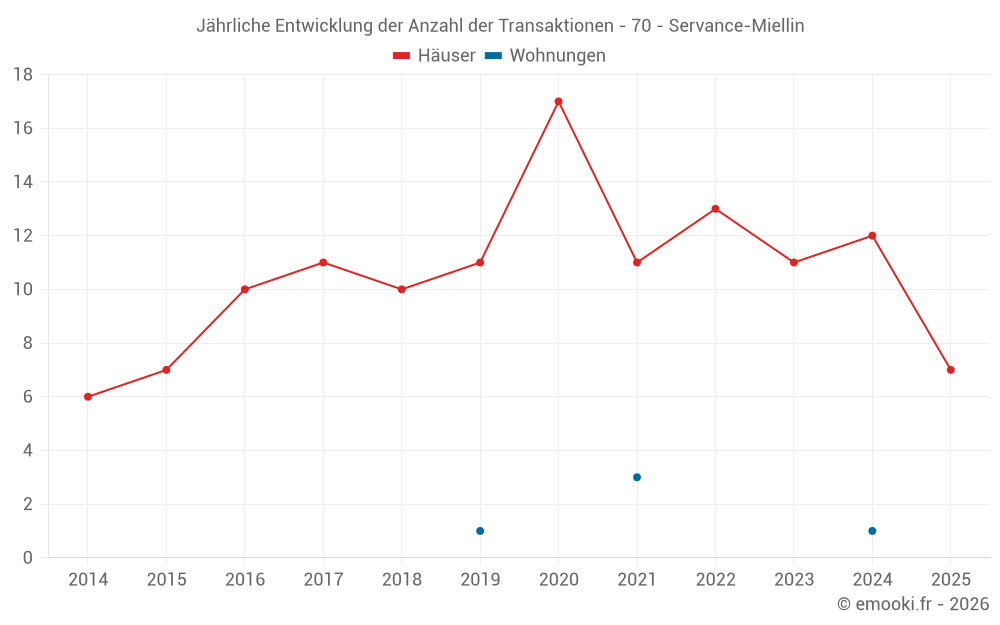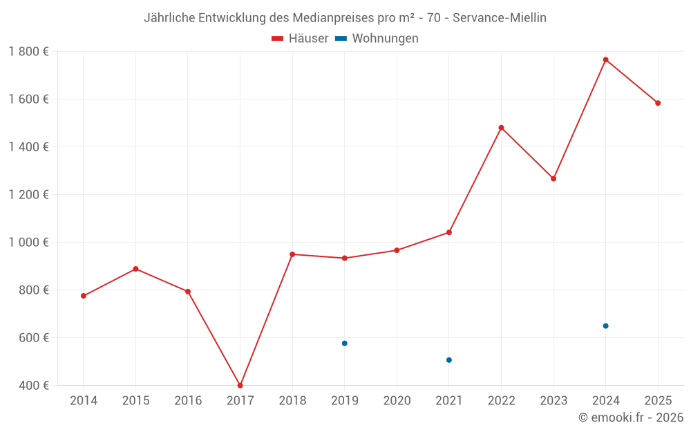 Der Durchschnittspreis auf den 21 Hausgeschäften der letzten 24 Monate in der Gemeinde Servance-Miellin betrug 1 602 € pro Quadratmeter für einen mittleren Immobilienwert von 100 000 €. Über diesen Zeitraum hinweg lagen 60% der Transaktionen zwischen 573 und 2 250 € pro Quadratmeter (vom 2. bis zum 8. Dezil).