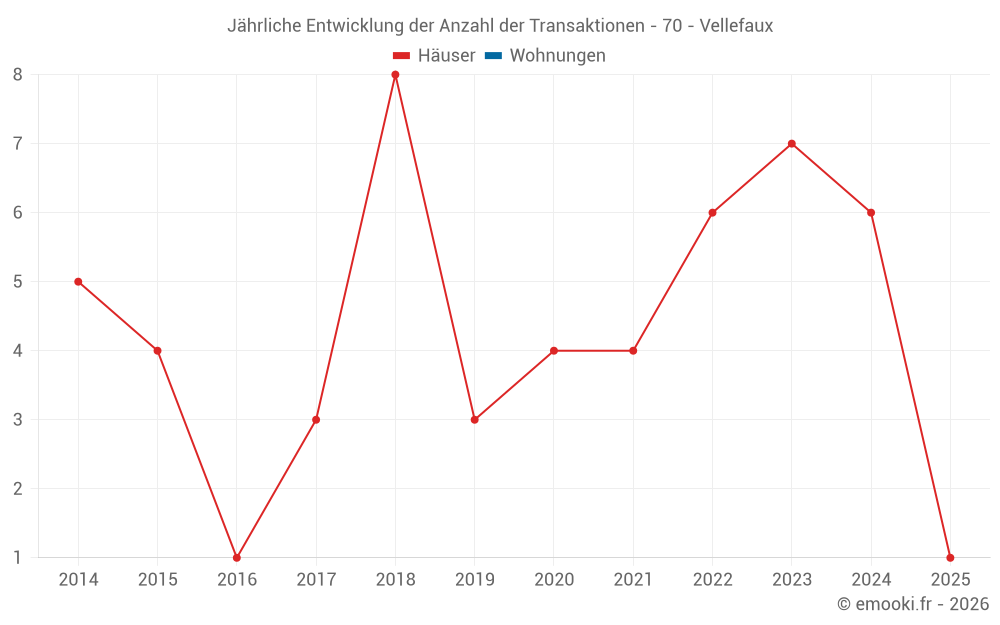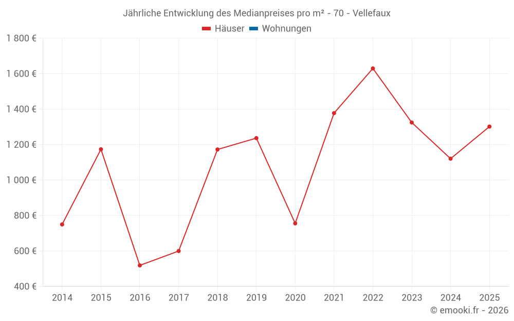 Der Durchschnittspreis auf den 14 Hausgeschäften der letzten 24 Monate in der Gemeinde Vellefaux betrug 1 272 € pro Quadratmeter für einen mittleren Immobilienwert von 139 125 €. Über diesen Zeitraum hinweg lagen 60% der Transaktionen zwischen 952 und 1 812 € pro Quadratmeter (vom 2. bis zum 8. Dezil).